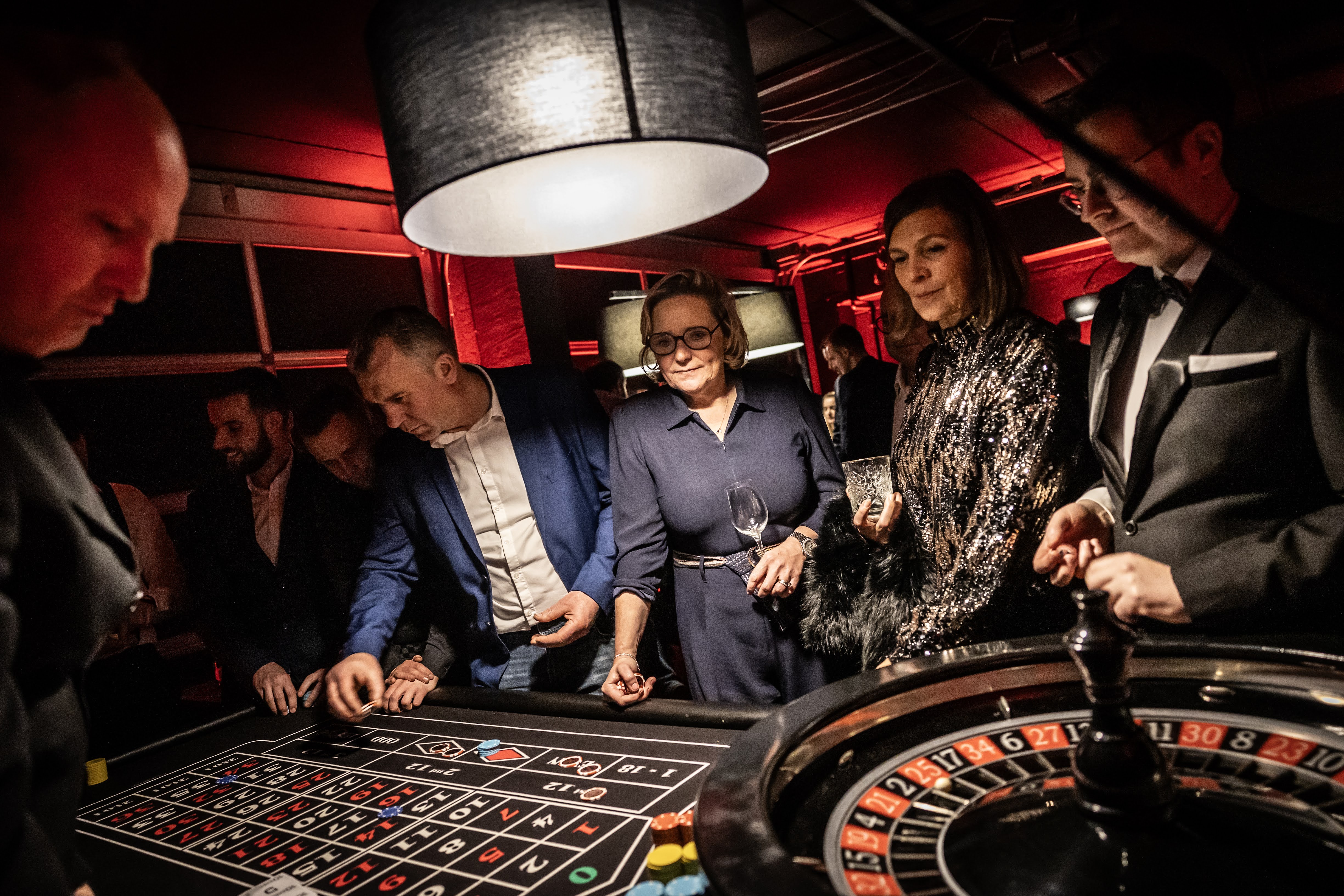 Voor de gelegenheid werd de afleverruimte van JLR Dejonckheere volledig omgetoverd tot een echt casino. Roulette, blackjack, poker en andere casinospelen brachten de sfeer van Las Vegas tot leven — zonder dat iemand z’n spaargeld hoefde te riskeren. Onze medewerkers konden hun winstkansen beproeven aan de verschillende speeltafels en genoten ondertussen van een gezellige, ontspannen avond samen met collega’s uit alle vestigingen van de groep.